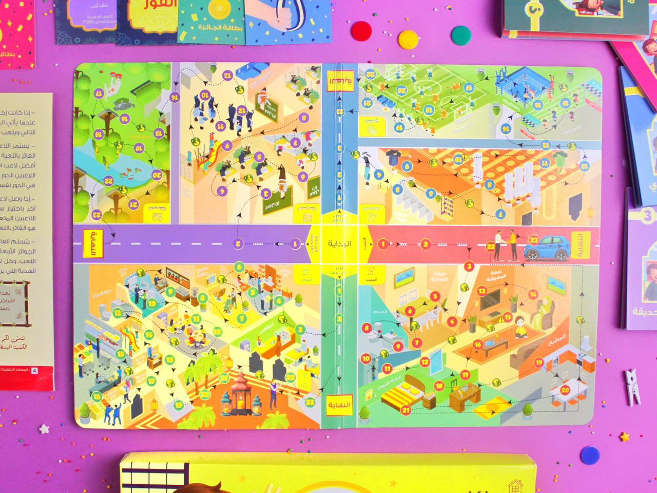 1️⃣ لوحة اللعب، وتتكون من 4 مسارات رئيسية، كل مسار يمر بأماكن معينة ويتكون من 23 موقف، بالإضافة إلى 7 أسئلة لنرى من يستطيع الوصول إلى نهاية مساره أولا