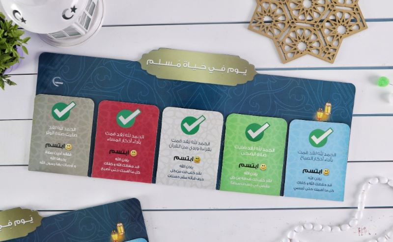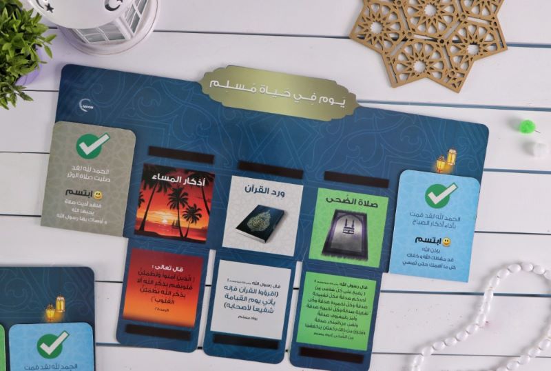 لوحة تعلمية ممغنطة لمساعدة الكبار والصغار على المواظبة على العبادات اليومية الهامة للمسلم عبارة عن لوحة من الكرتون بلاصق في الخلف تعلق على الحائط مقسمة إلى 5 خانات تشمل العبادات اليومية الهامة في يوم المسلم